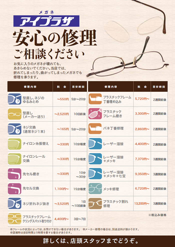 - お客様の大切にお使い頂いているメガネの修理承ります。 フレームのユガミ、型直し、ズレ落ちなどの店頭修理はサービスでお直し致します。修理の事なら何でもご相談下さい。